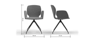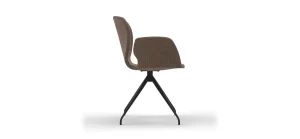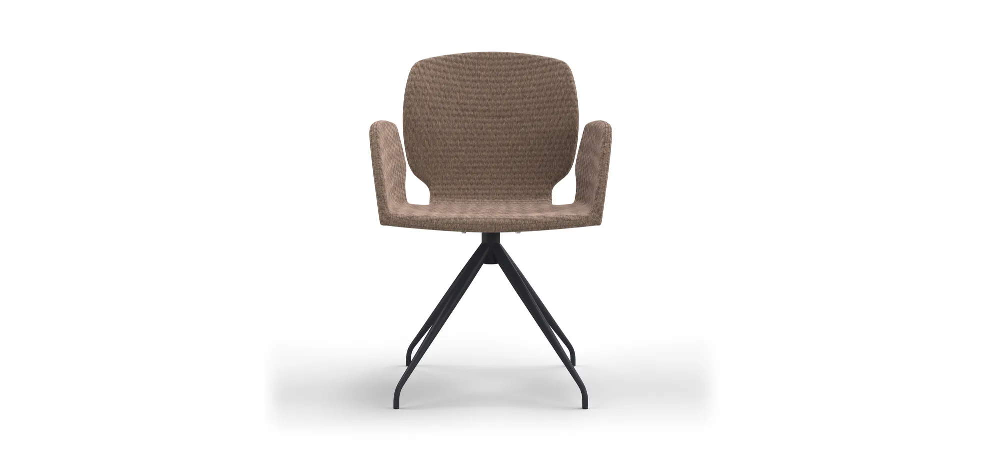 Elegant lagert die Sitzschale, in hochwertigen Leder- oder Stoffbezügen, auf einem schwarzen Metall-Stativgestell. Es verleiht dem Stuhl eine beschwingte und leichte Note.