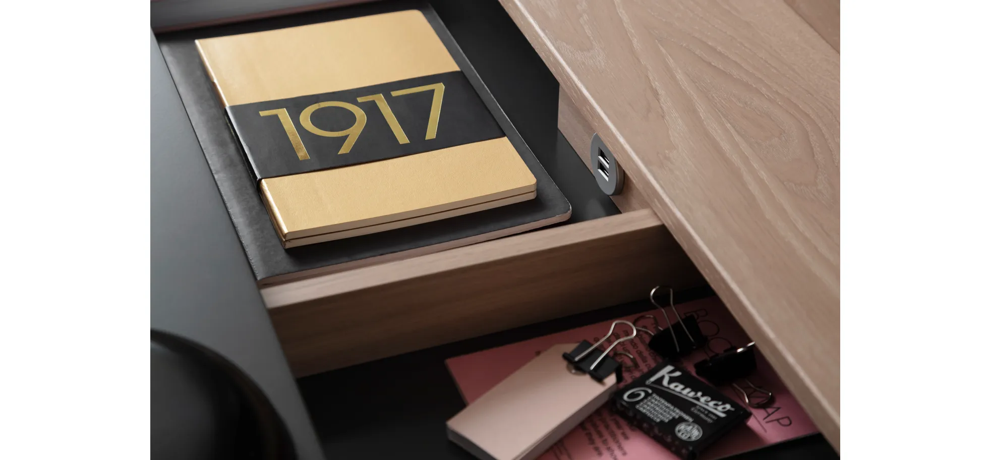 Die Funktionalitäten, wie etwa die ausziehbare Arbeitsplatte sowie der praktische USB-Anschluss des Schreibtischs Contur® Cantona, werden durch ansprechende Gestaltung unterstützt.