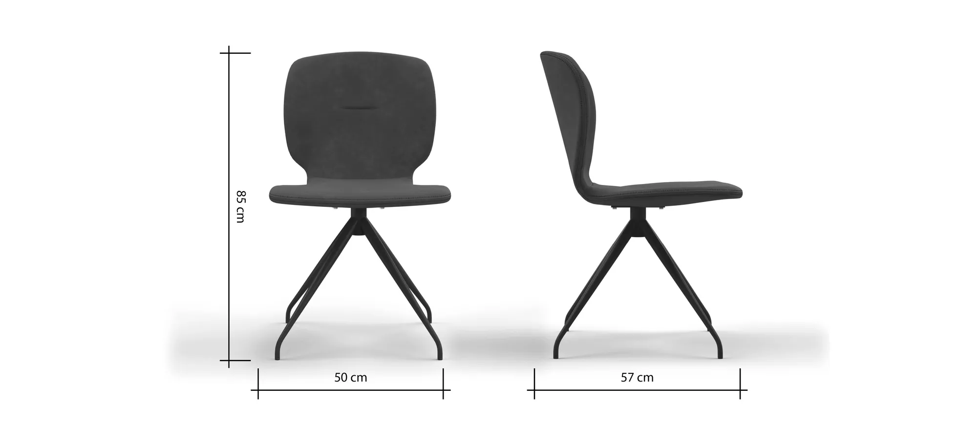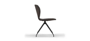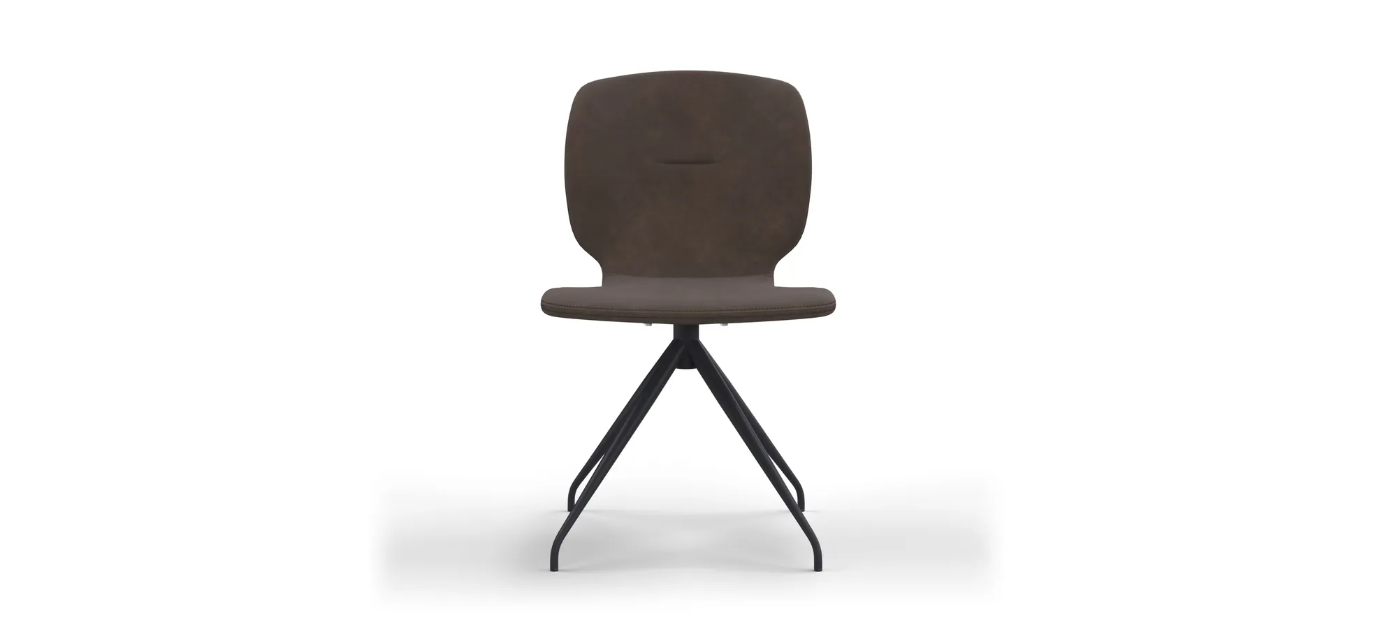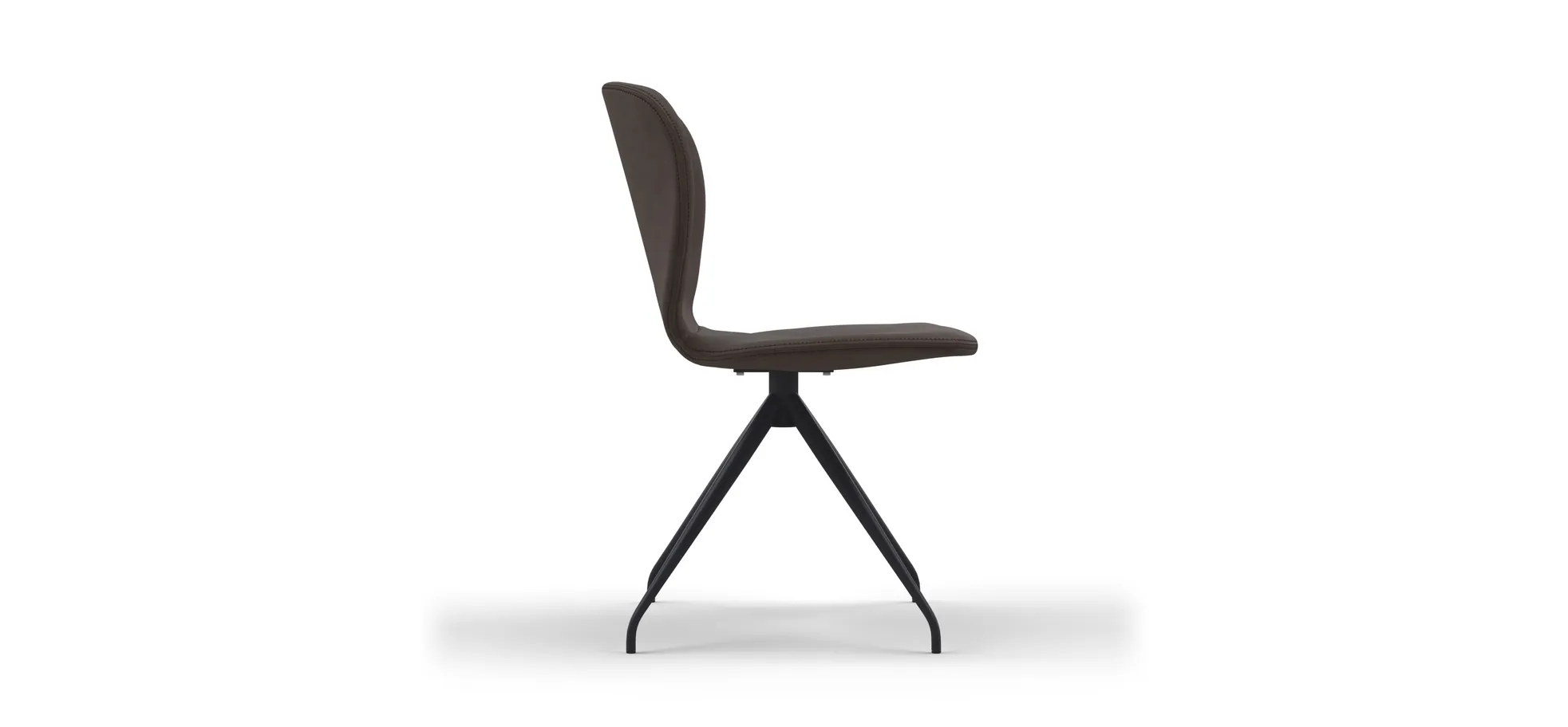 Elegant lagert die Sitzschale, in hochwertigen Leder- oder Stoffbezügen, auf einem schwarzen Metall-Stativgestell. Es verleiht dem Stuhl eine beschwingte und leichte Note.