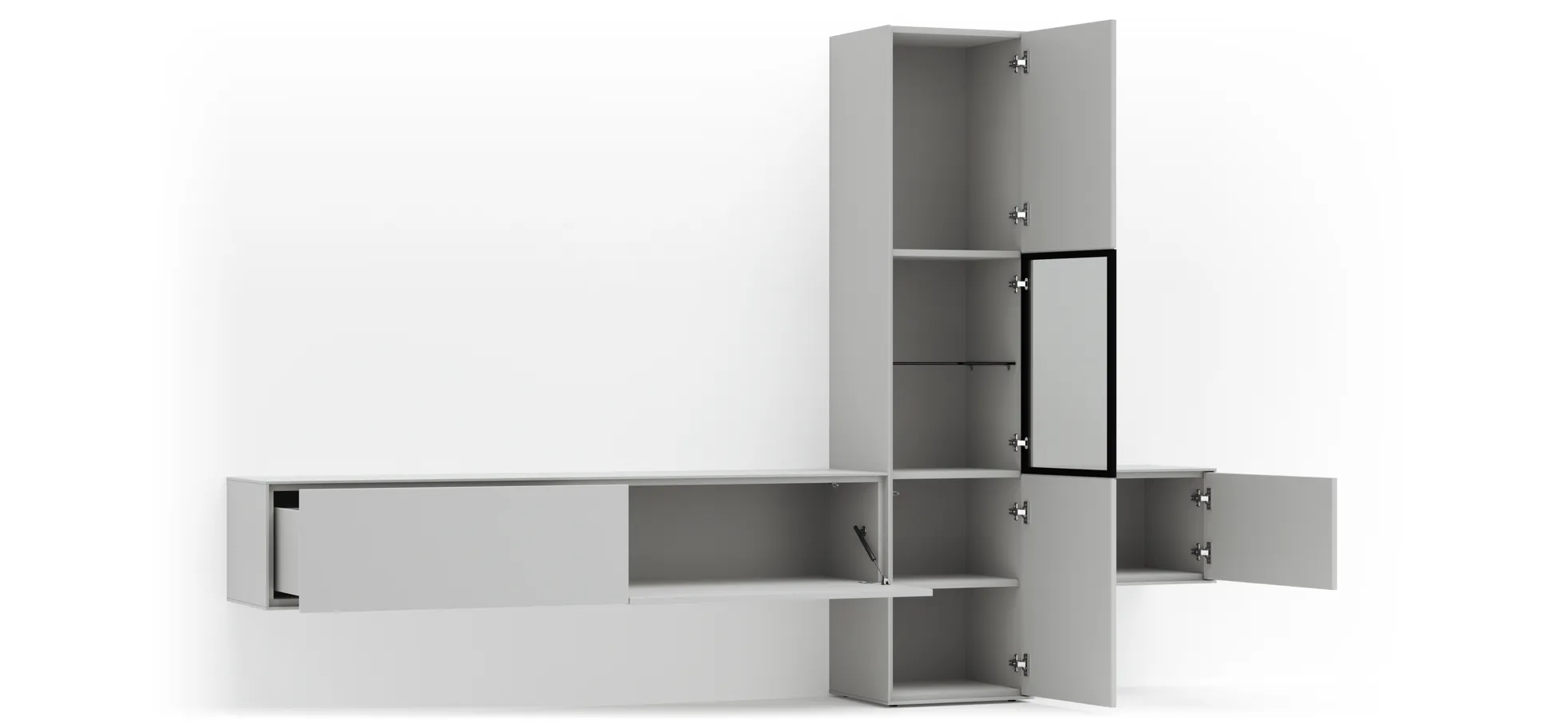 Die Wohnwand Medio von Global Family ist eine elegante und moderne Ergänzung für dein Wohnzimmer. Mit einer Höhe von ca. 195 cm und einer Tiefe von ca. 41 cm bietet sie viel Stauraum, ohne dabei aufdringlich zu wirken. Die Wohnwand verfügt über eine Klappe, eine Schublade und zwei Türen, die alle mit der grifflosen Push to Open-Technik ausgestattet sind, was eine einfache Handhabung ermöglicht. Die Lackierung in Weiß verleiht dem Möbelstück eine frische und zeitlose Optik.